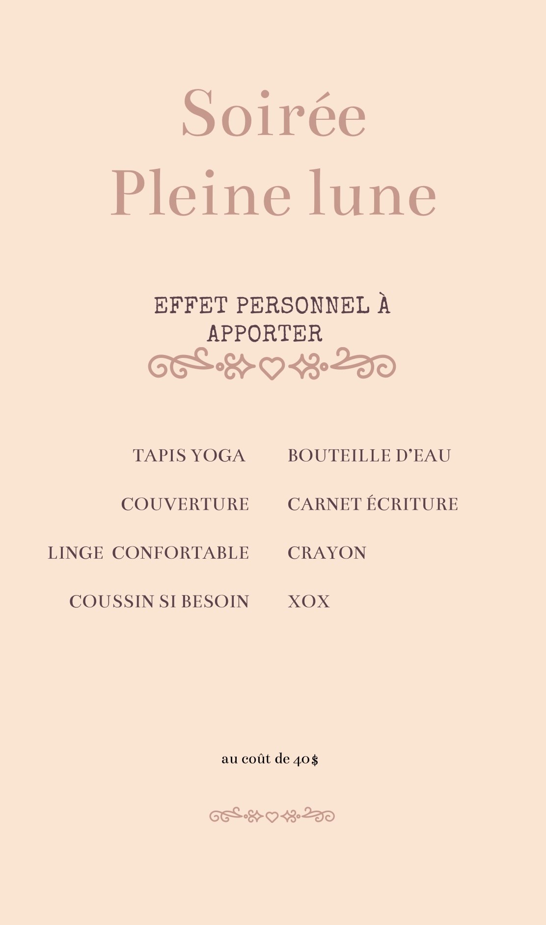 Viens te reconnecter, te déposer et reprendre pleinement ton pouvoir intérieur.Je t’accueille dans un espace de douceur, où la respiration consciente, les mouvements, la danse et la relaxation t’inviteront à revenir au centre de ton cœur.En cette soirée de la dernière lune de décembre 2025, nous vivrons un moment puissant, idéal pour manifester le nouveau et ouvrir la porte à l’énergie de 2026. Nous terminerons ensemble un grand cycle karmique, afin de libérer le passé et avancer vers la lumière de notre futur.L’année 2026 sera une année d’abondance dans tous les aspects, et pour attirer ce renouveau, il est essentiel de s’ancrer profondément, afin de ne plus répéter les anciens schémas du passé.Une soirée riche, vibrante et remplie d’énergies transformantes t’attend.Nombre de place limitée
